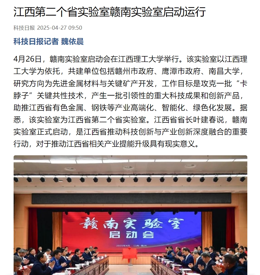 为依托,共建单位包括赣州市政府、鹰潭市政府、南昌大学,研究方向为先进金属材料与关键矿产开发,工作目标是攻克一批“卡脖子”关键共性技术,产生一批引领性的重大科技成果和创新产品,助推江西省有色金属、钢铁等产业高端化、智能化、绿色化发展。据悉,该实验室为江西省第二个省实验室。江西省省长叶建春说,赣南实验室正式启动,是江西省推动科技创新与产业创新深度融合的重要行动,对于推动江西省相关产业提能升级具有现实意义。