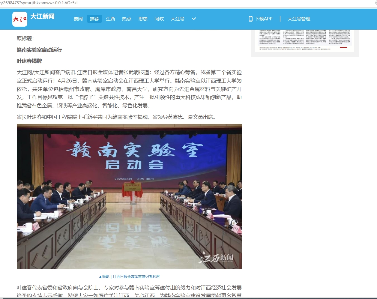 大江网/大江新闻客户端讯 江西日报全媒体记者张武明报道:经过各方精心筹备,我省第二个省实验室正式启动运行!4月26日,赣南实验室启动会在快猫