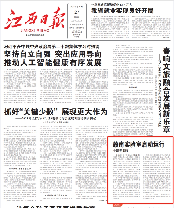 本报赣州讯 (全媒体记者张武明)经过各方精心筹备,我省第二个省实验室正式启动运行!4月26日,赣南实验室启动会在快猫