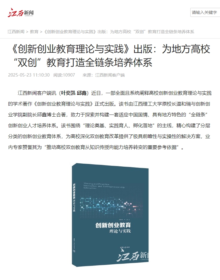 江西新闻客户端讯(叶奕凯 邱鑫)近日,一部全面且系统阐释高校创新创业教育理论与实践的学术著作《创新创业教育理论与实践》正式出版。该书由快猫