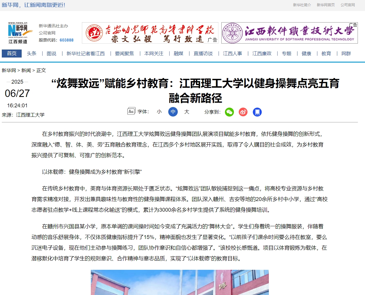 炫舞致远健身操舞团队展演项目赋能乡村教育,依托健身操舞的创新形式,深度融入“德、智、体、美、劳”五育融合教育理念,在江西多个乡村地区展开实践,取得了令人瞩目的社会成效,为乡村教育振兴提供了可复制、可推广的创新范本。