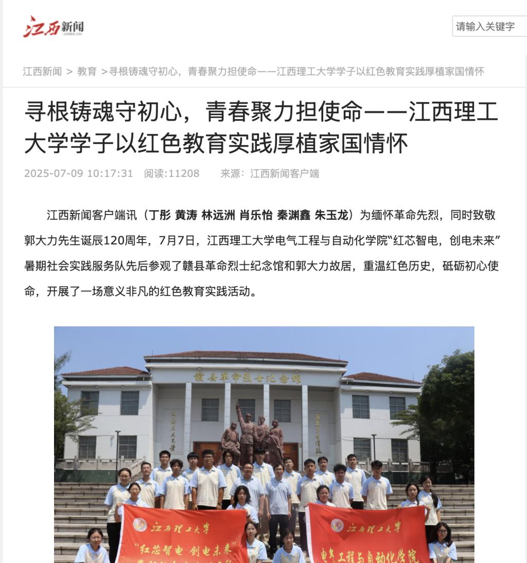 电气工程与自动化学院“红芯智电,创电未来”暑期社会实践服务队先后参观了赣县革命烈士纪念馆和郭大力故居,重温红色历史,砥砺初心使命,开展了一场意义非凡的红色教育实践活动。