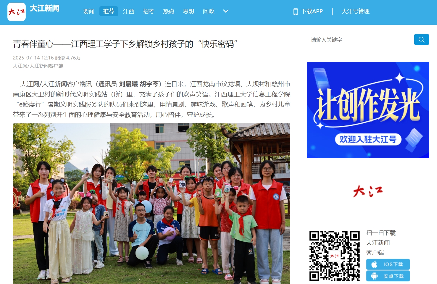 此次“星火”实践队的游州村之行,是“万名大学生进千站”行动的生动缩影。队员们发挥专业所长,将化学知识化为趣味科普;巧设亲子游戏,架起心灵桥梁;筑牢安全课堂,守护生命成长。他们用专业知识服务基层,以青春热情奉献社会,在服务乡村振兴的火热实践中,践行“强国有我,青春有为”的使命担当,让科学探索的精神和人文关怀的暖流在乡间传递。