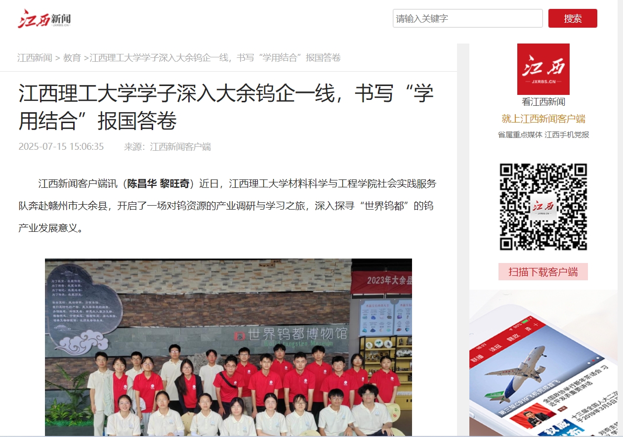 材料科学与工程学院社会实践队走进企业、深入研究院,全面深入调查了钨产业的方方面面。企业调查让队员们明确了行业技能需求与自身短板,为职业生涯规划提供了清晰坐标;这段经历还拓宽了实践队队员视野,让队员们深刻认识到专业知识的实际价值与科技创新的引领作用,更体会到“大学生下基层”的深意 。他们更加明白,青年学子需像钨经冶炼成合金般,在基层实践中淬炼,将学识转化为推动产业升级的力量,唯有让知识走出象牙塔、青春融入基层,才能在产业报国中实现成长与价值。