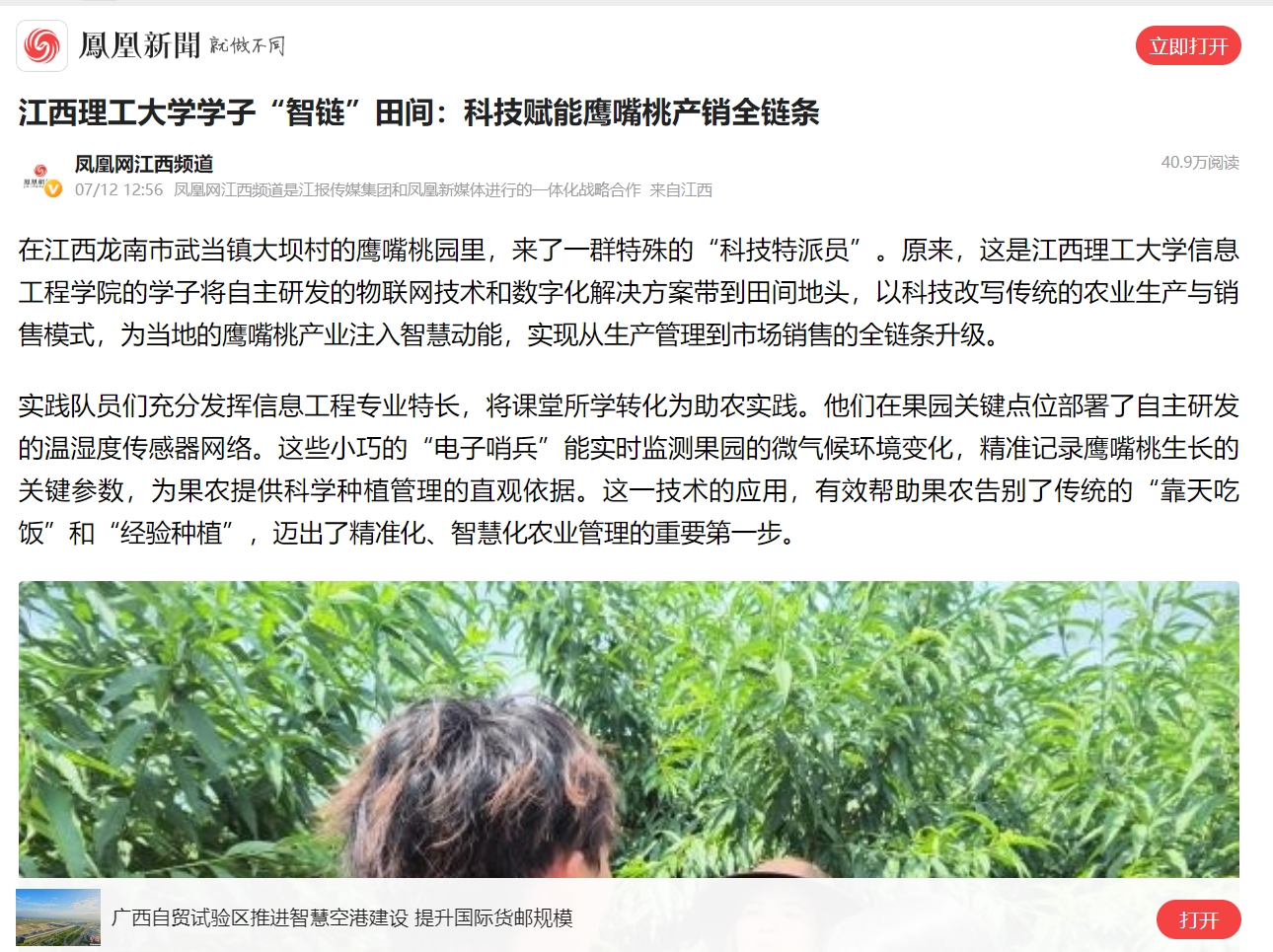 信息工程学院通过此次社会实践活动,不仅为龙南鹰嘴桃产业插上了数字化翅膀,有效促进了农民增收,更探索出一条可复制、可推广的“高校智慧助农”新路径,充分彰显了新时代青年学子学以致用、服务社会、贡献乡村的责任担当。(文/胡宇芩、刘晨曦)