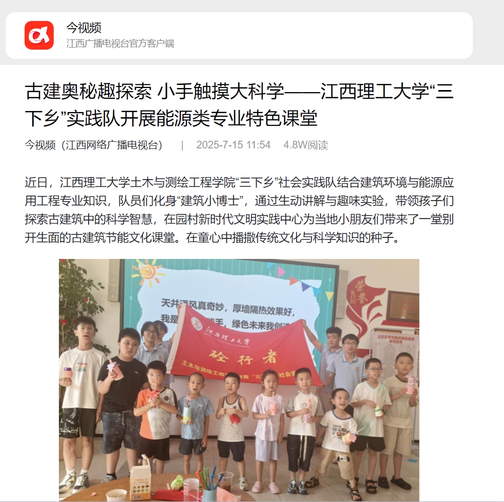 土木与测绘工程学院“三下乡”社会实践队结合建筑环境与能源应用工程专业知识,队员们化身“建筑小博士”,通过生动讲解与趣味实验,带领孩子们探索古建筑中的科学智慧,在园村新时代文明实践中心为当地小朋友们带来了一堂别开生面的古建筑节能文化课堂。在童心中播撒传统文化与科学知识的种子。