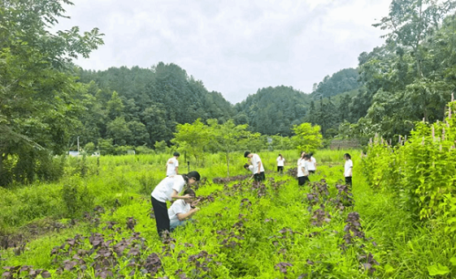 江西中医药大学实践队在中草药种植基地,跟随药农学习黄精、茯苓等道地药材的种植技术