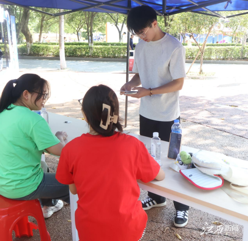 在书香阁“美食江湖”站点,新生和家长们解锁校园美味的同时,还积极参与着“安全标识猜猜看”快问快答互动。大家转动标识转盘,快速答出禁止烟火、当心触电等常见安全标志含义,在休闲场景中轻松习得实用安全常识。