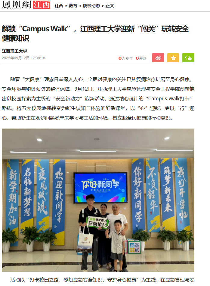 应急管理与安全工程学院创新推出以校园探索为主线的“安全新动力”迎新活动,通过精心设计的“Campus Walk打卡”路线,将五大校园地标转变为新生认知与体验的鲜活课堂,以“心”迎新、更以“行”迎心,帮助新生在脚步间熟悉未来学习与生活的环境,树立起全民健康的行动意识。