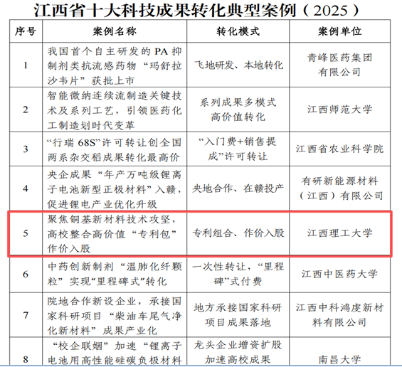 紧密聚焦江西省加快推进制造业高质量发展、积极打造国家级先进制造业集群的战略部署,成果转化项目“聚焦铜基新材料技术攻坚,高校整合高价值‘专利包’作价入股”以专利组合为“金钥匙”、以作价入股为“新路径”,凭借对产业升级的显著推动作用及对成果转化模式的创新突破,成功入选 2025 江西省十大科技成果转化典型案例,为高校服务地方产业发展树立了示范标杆。