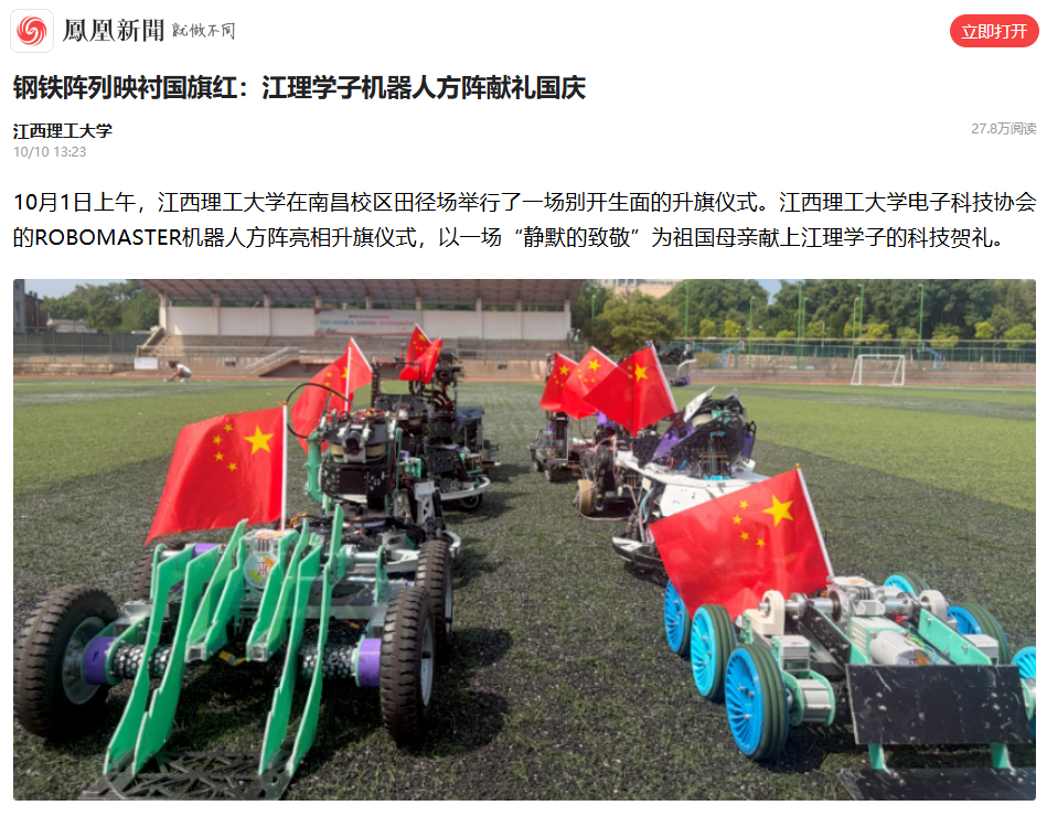 电子科技协会的ROBOMASTER机器人方阵亮相升旗仪式,以一场“静默的致敬”为祖国母亲献上江理学子的科技贺礼。