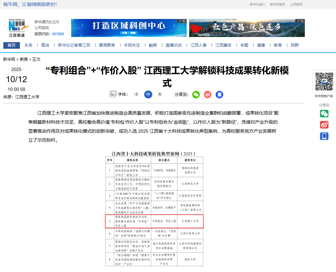 先进铜产业学院(鹰潭)院长、江西先进铜功能材料科技有限公司总经理肖翔鹏表示:“这次入选2025年江西省十大科技成果转化典型案例,既是对学校科技成果转化工作的充分认可,也将推动学校‘专利包集成+产业联盟’转化模式在全省乃至全国范围内推广,为更多相关产业领域的创新发展提供可复制、可借鉴的实践样本。”(何熠楠)