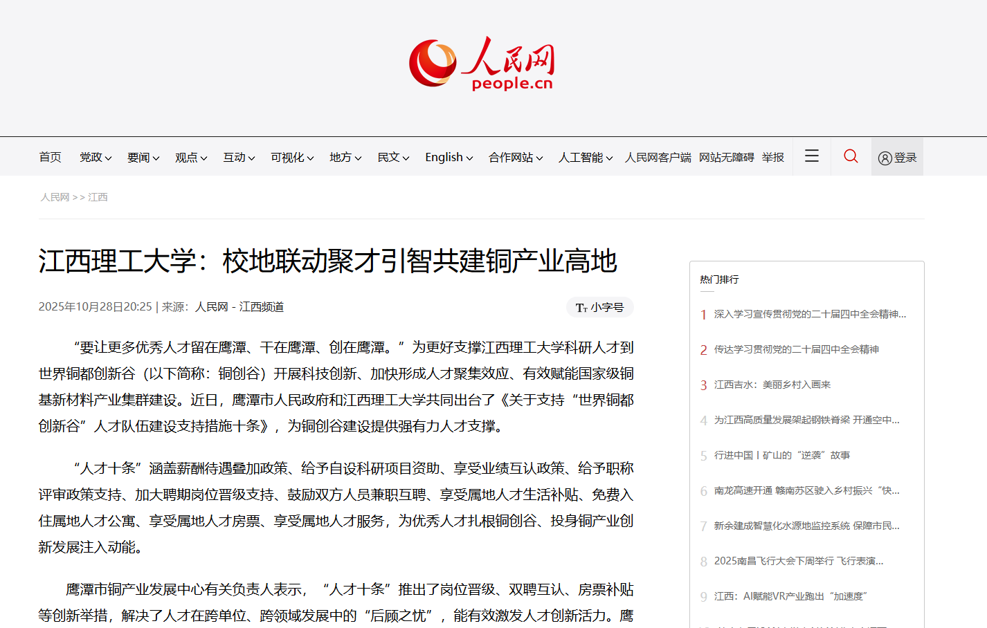 鹰潭市铜产业发展中心有关负责人表示,“人才十条”推出了岗位晋级、双聘互认、房票补贴等创新举措,解决了人才在跨单位、跨领域发展中的“后顾之忧”,能有效激发人才创新活力。鹰潭将以“人才十条”进一步推动校地人才深度融合,为铜基新材料领域的技术攻关与成果转化按下“加速键”,为国家级铜基新材料集群建设注入“智力内核”,最终实现人才价值与产业发展的同频共振,推动鹰潭从“铜都”向“铜创高地”的跨越升级。