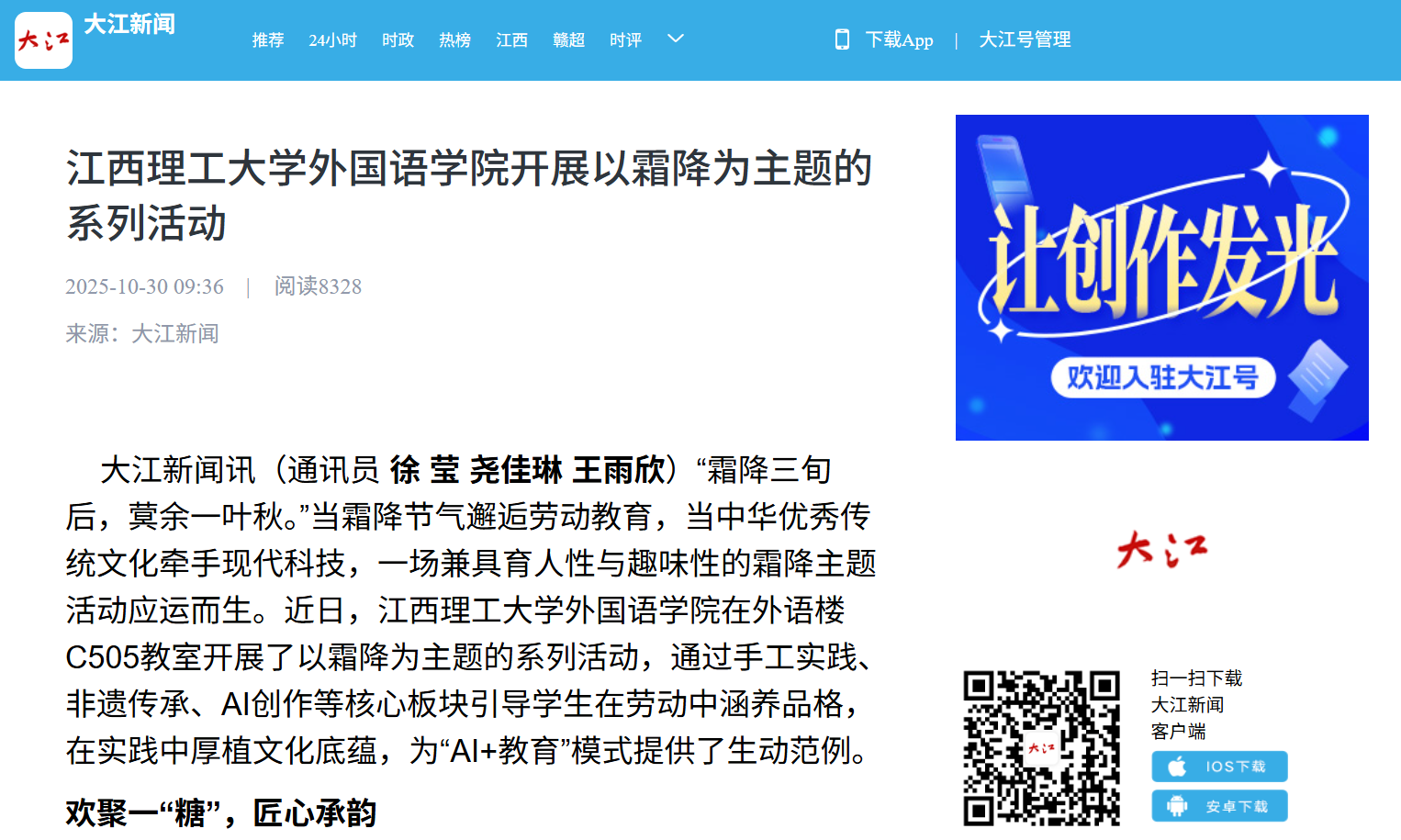 外国语学院在外语楼C505教室开展了以霜降为主题的系列活动,通过手工实践、非遗传承、AI创作等核心板块引导学生在劳动中涵养品格,在实践中厚植文化底蕴,为“AI+教育”模式提供了生动范例。
