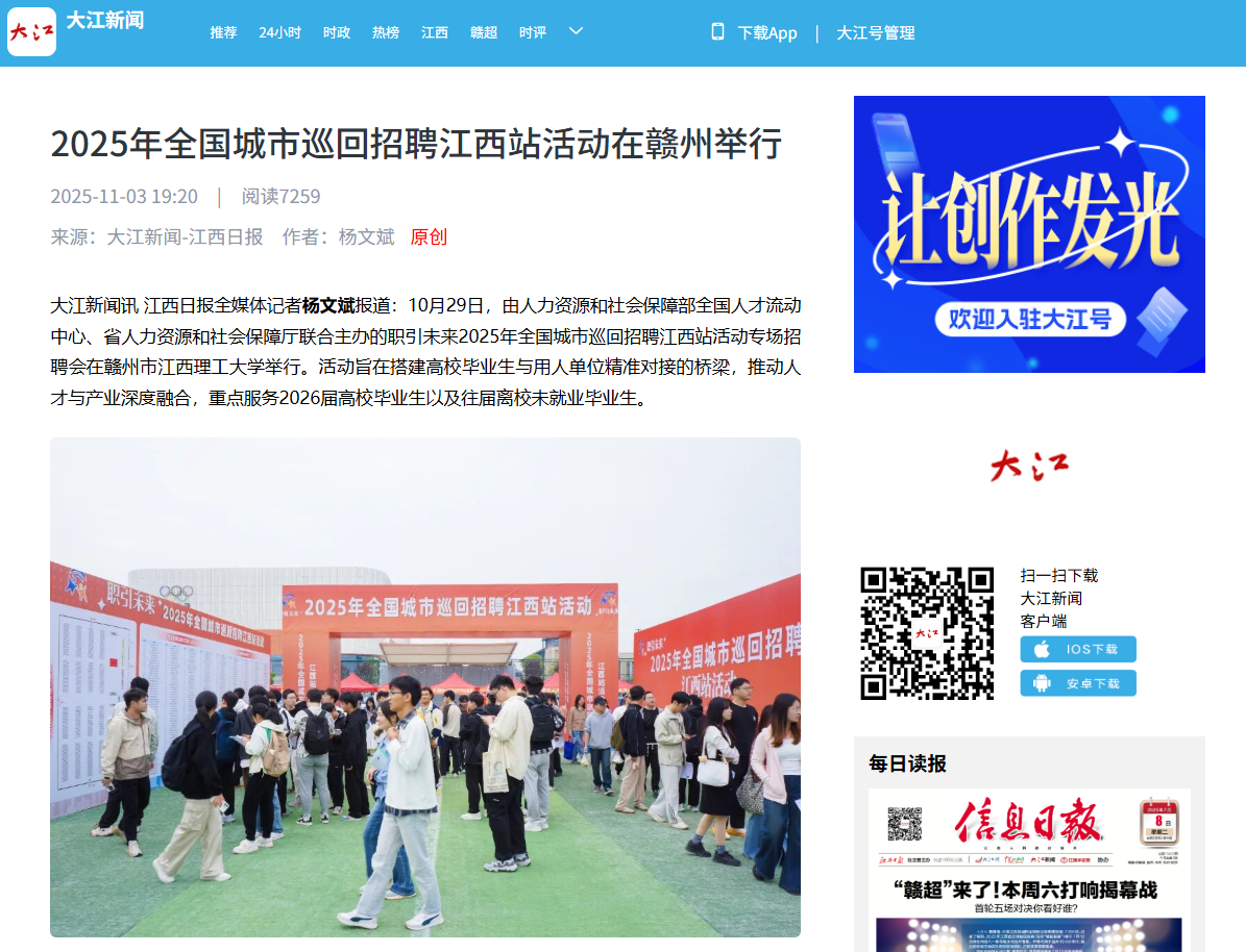 大江新闻讯 江西日报全媒体记者杨文斌报道:10月29日,由人力资源和社会保障部全国人才流动中心、省人力资源和社会保障厅联合主办的职引未来2025年全国城市巡回招聘江西站活动专场招聘会在赣州市快猫 举行。活动旨在搭建高校毕业生与用人单位精准对接的桥梁,推动人才与产业深度融合,重点服务2026届高校毕业生以及往届离校未就业毕业生。
