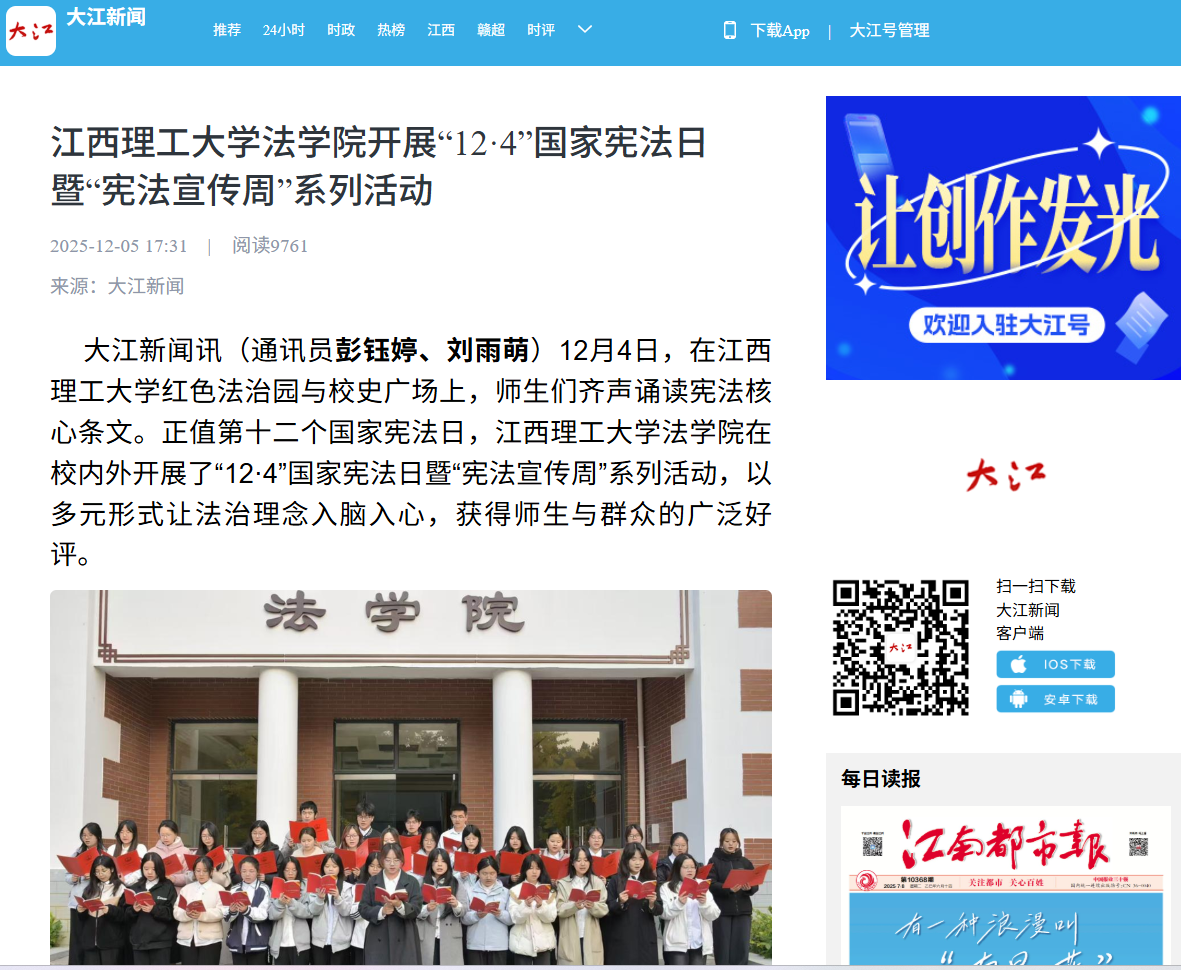 法学院在校内外开展了“12·4”国家宪法日暨“宪法宣传周”系列活动,以多元形式让法治理念入脑入心,获得师生与群众的广泛好评。