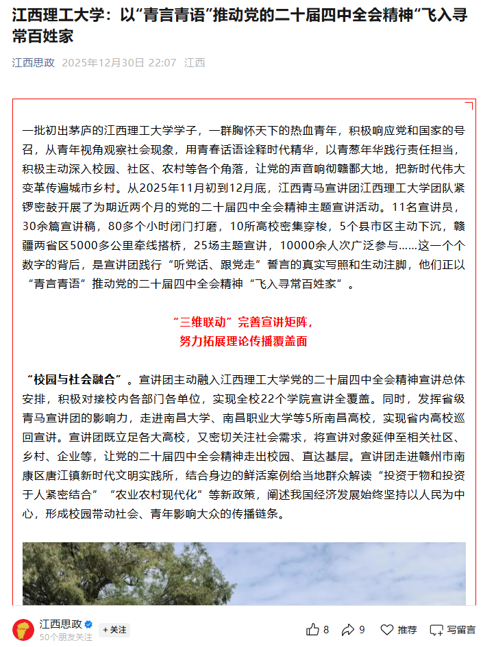 团队以“小切口”讲述“大政策”、以“涓涓细流”传播“国之大者”,从赣江之畔的红土沃野到天山脚下的边疆热土,从书香满园的菁菁校园到瓜果飘香的阡陌田野,以青春为帆、以理论为炬,用青年视角的鲜活表达、贴近民心的生动叙事,让党的二十届四中全会精神如春风化雨般浸润人心、落地生根。这不仅打通了党的创新理论传播的“最后一公里”,更架起了政策与民心、理论与实践的连心桥,让抽象的顶层设计转化为大江南北、各行各业受众可感可知、可学可践的行动指南,为凝聚全社会思想共识、汇聚发展合力注入了强大精神动力。