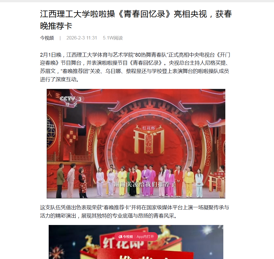 体育与艺术学院“80热舞青春队”正式亮相中央电视台《开门迎春晚》节目舞台,并表演啦啦操节目《青春回忆录》。央视总台主持人尼格买提、苏眉文,“春晚推荐团”关凌、乌日娜、蔡程昱还与学校登上表演舞台的啦啦操队成员进行了深度互动。