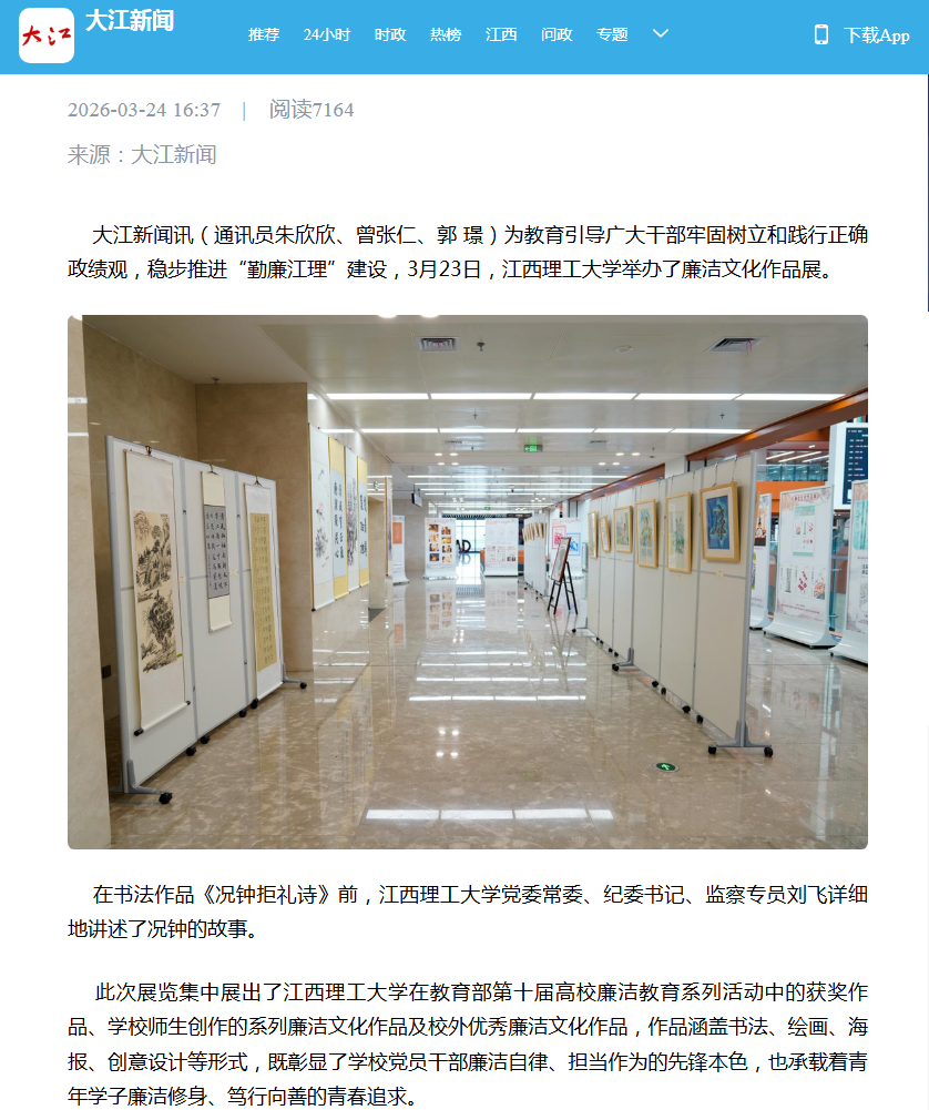 在教育部第十届高校廉洁教育系列活动中的获奖作品、学校师生创作的系列廉洁文化作品及校外优秀廉洁文化作品,作品涵盖书法、绘画、海报、创意设计等形式,既彰显了学校党员干部廉洁自律、担当作为的先锋本色,也承载着青年学子廉洁修身、笃行向善的青春追求。