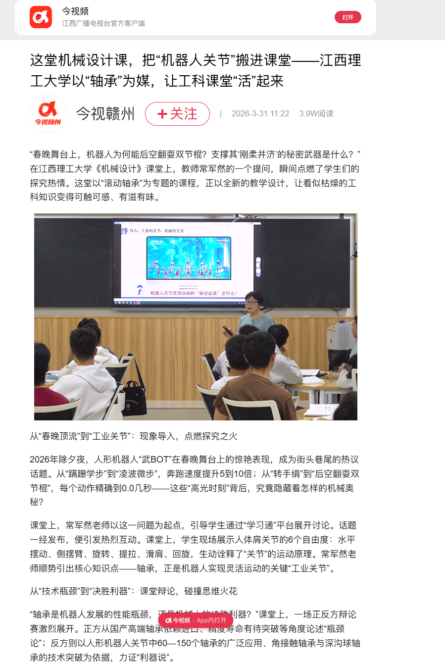 “轴承是机器人发展的性能瓶颈,还是机械人的决胜利器?”课堂上,一场正反方辩论赛激烈展开。正方从国产高端轴承依赖进口、精度寿命有待突破等角度论述“瓶颈论”;反方则以人形机器人关节中60—150个轴承的广泛应用、角接触轴承与深沟球轴承的技术突破为依据,力证“利器说”。