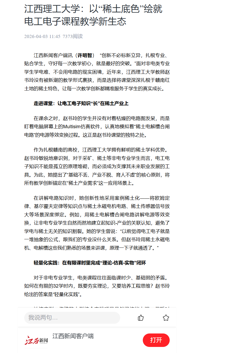 的教学园地里,赵书玲用她的实践证明:当教学创新深深扎根于专业土壤,紧密贴合学生实际,即使是最传统的电工电子课程,也能焕发出独特而持久的生命力。她的目标从来不是做多么炫酷的教学创新,而是让学生通过这门课,既能掌握专业技能,又能读懂学校的稀土情怀,这就是她要守住的育人初心。