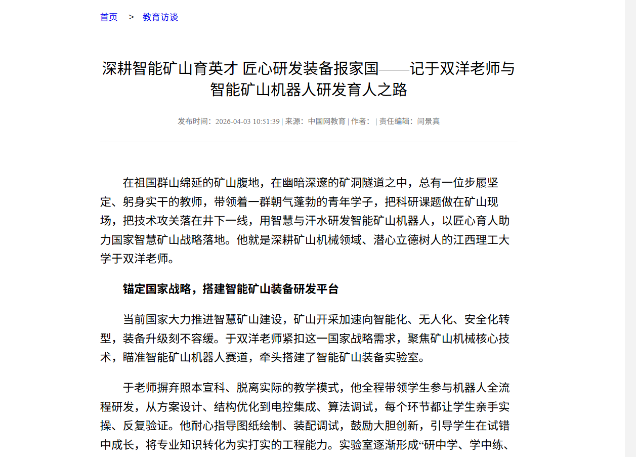 未来,于双洋老师将继续坚守育人岗位,深耕智能矿山领域,攻坚关键核心技术,培育更多高素质创新型矿山人才,以科技赋能产业、以教育点亮征程,助力祖国矿山事业高质量发展。(于双洋)