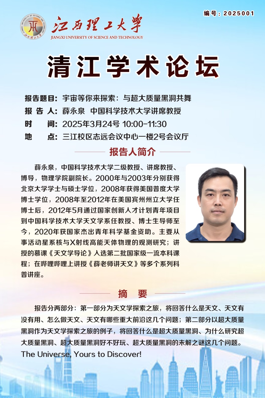 讲座背景:薛永泉,中国科学技术大学二级教授、讲席教授、博士生导师。2000年与2003年分别获得北京大学学士与硕士学位,2008年获得美国普渡大学博士学位,2008年至2012年在美国宾州州立大学任博士后,2012年5月通过国家创新人才计划青年项目到中国科学技术大学天文学系任教授、博士生导师至今,2020年获国家杰出青年科学基金资助。主要从事活动星系核与X射线高能天体物理的观测研究;讲授的慕课《天文学导论》入选第二批国家级一流本科课程;在哔哩哔哩上讲授《薛老师讲天文》等多个系列科普讲座。