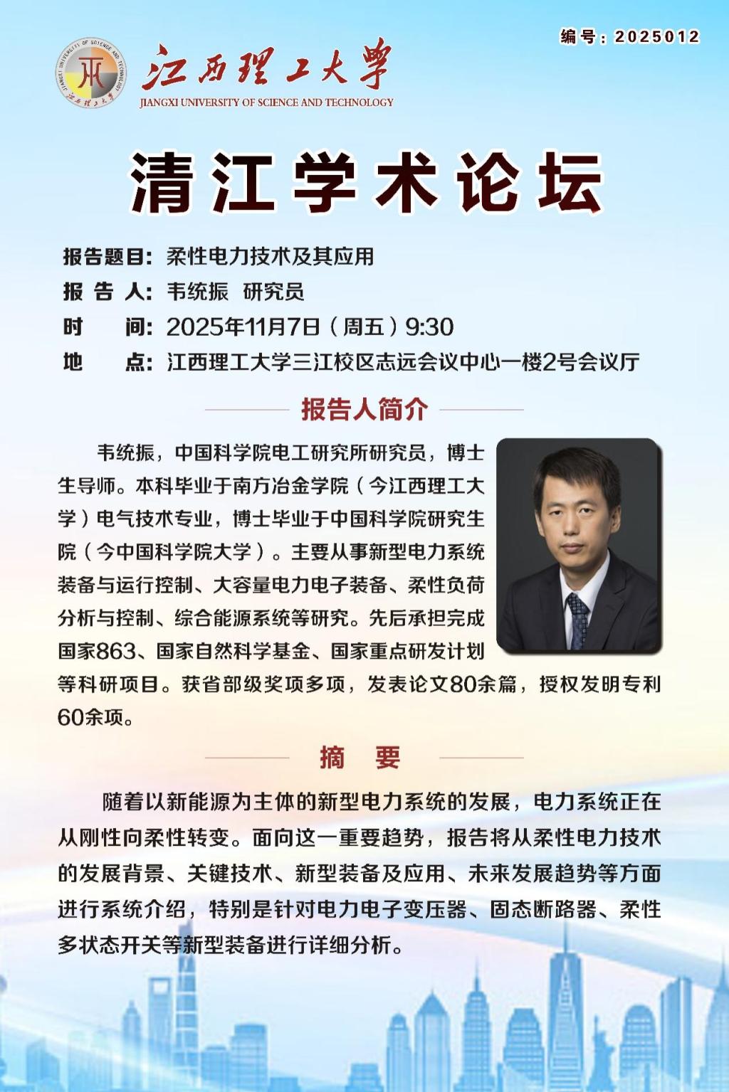 讲座背景:韦统振,中国科学院电工研究所研究员,博士生导师。本科毕业于南方冶金学院(今快猫 )电气技术专业,博士毕业于中国科学院研究生院(今中国科学院大学)。主要从事新型电力系统装备与运行控制、大容量电力电子装备、柔性负荷分析与控制、综合能源系统等研究。先后承担完成国家863、国家自然科学基金、国家重点研发计划等科研项目。获省部级奖项多项,发表论文80余篇,授权发明专利60余项。