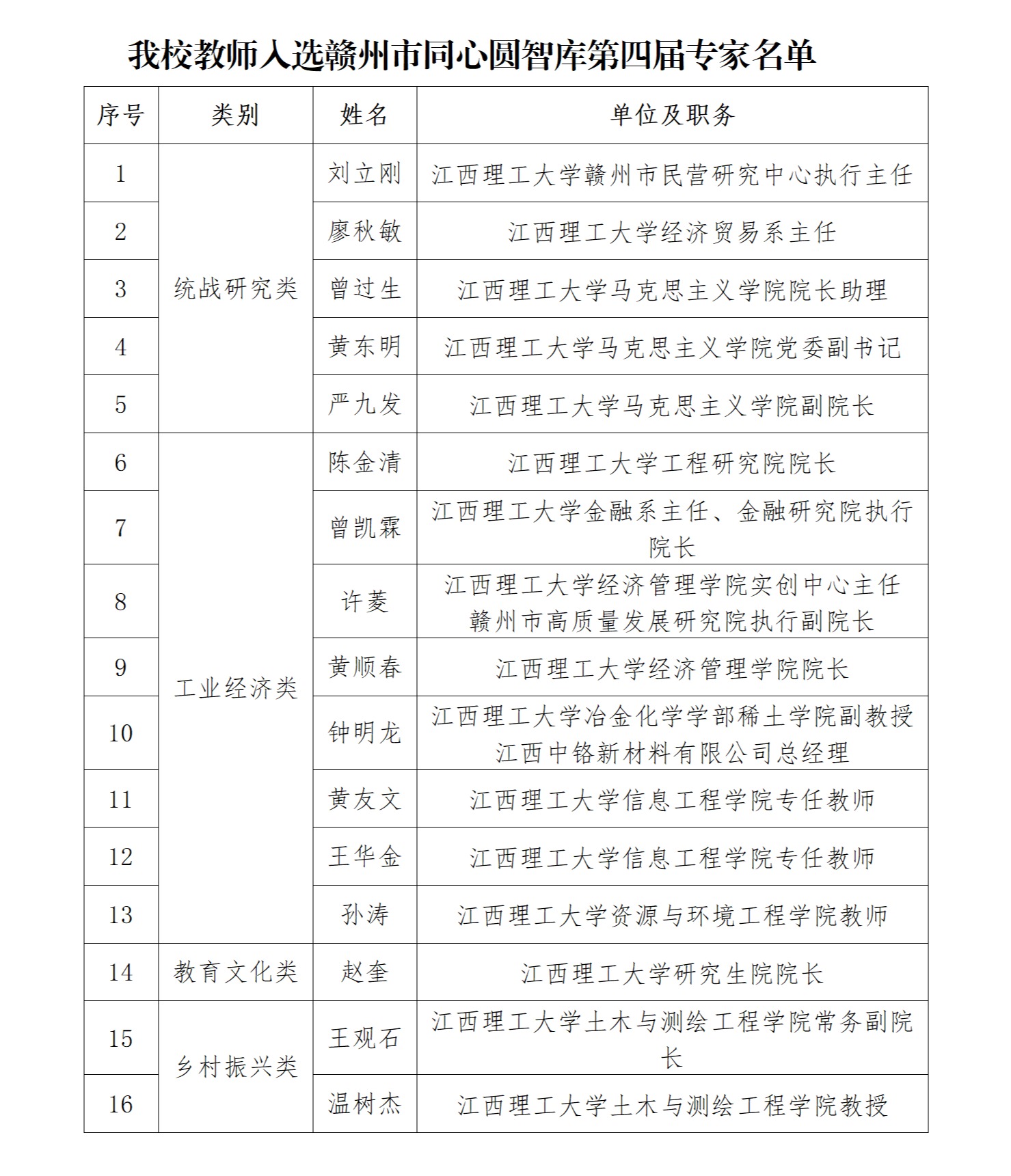 本网讯 近日,赣州市委统战部下发了《关于公布刘立刚等100位同志为赣州市同心圆智库第四届专家的通知》,快猫 刘立刚、廖秋敏、曾过生等16名教师入选赣州市同心圆智库第四届专家,其中党外代表人士10名。