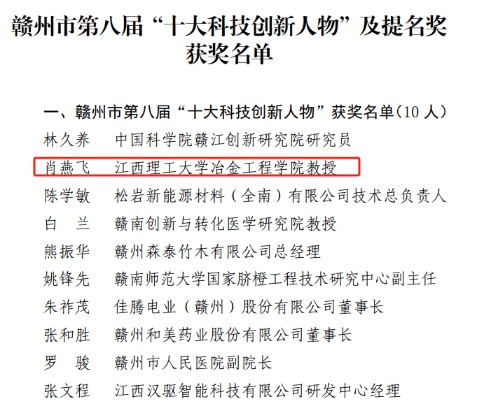 冶金工程学院肖燕飞教授荣获赣州市第八届“十大科技创新人物”称号。