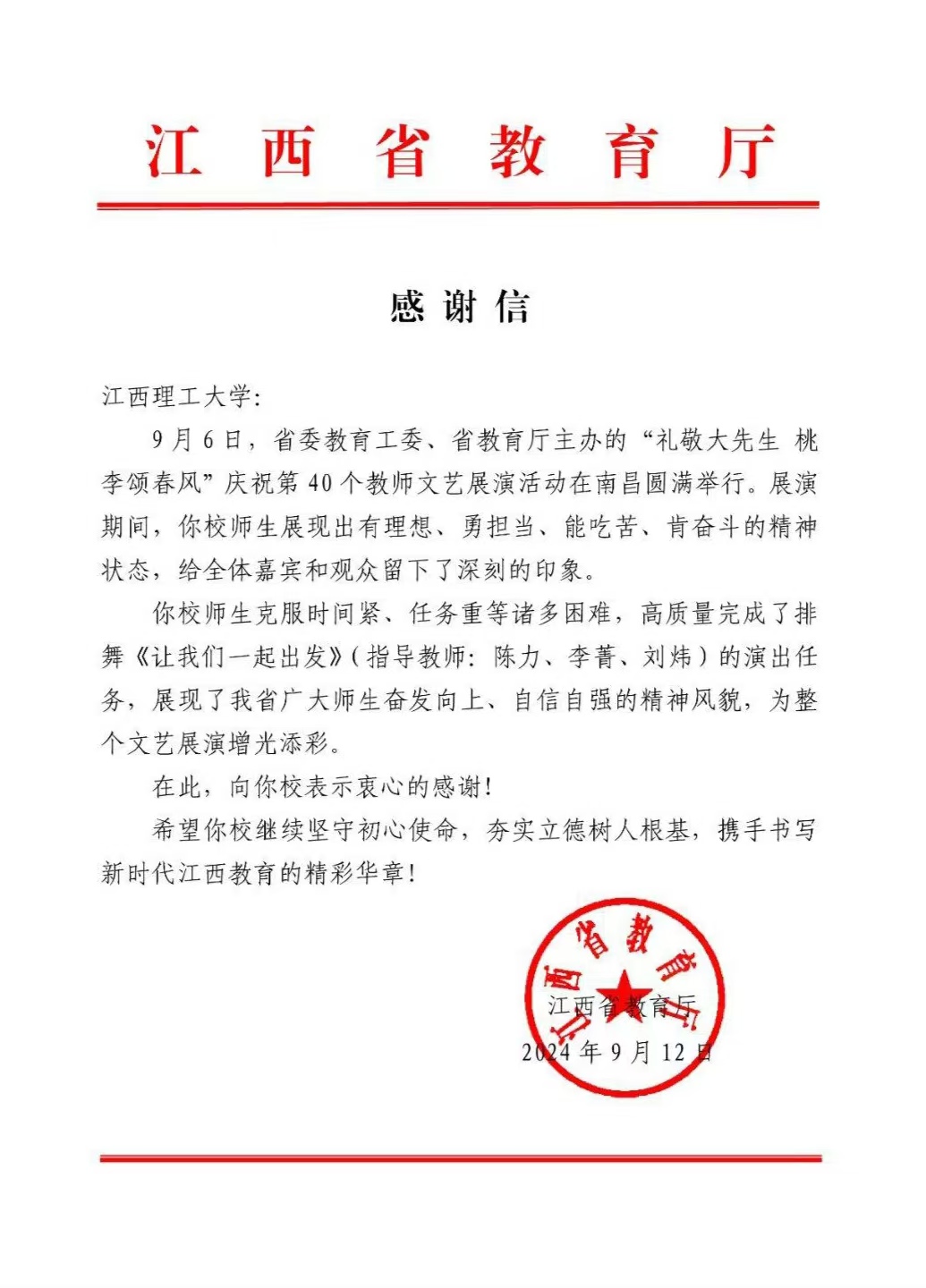 本网讯 9月12日,江西省教育厅向快猫 啦啦操队发来感谢信,信中对学校啦啦操队以“有理想、勇担当、能吃苦、肯奋斗的精神状态”克服诸多困难,高标准完成了排舞《让我们一起出发》节目给予了高度认可,对学校啦啦操队为整个文艺展演作出的卓越贡献致以最诚挚的感谢。