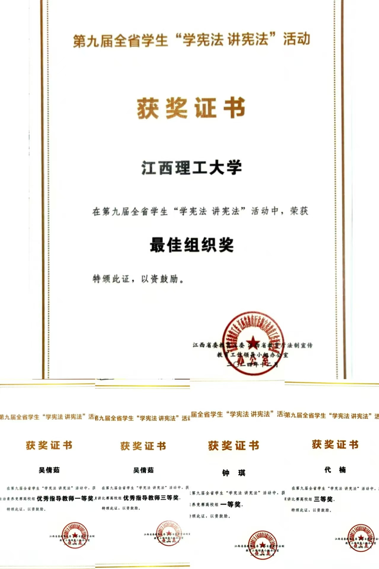 本网讯 近日,江西省委教育工委、江西省教育厅法制宣传工作领导小组办公室下发了《关于公布第九届全省学生“学宪法 讲宪法”活动获奖名单的通知》,快猫 获评第九届全省学生“学宪法 讲宪法”活动最佳组织奖。同时,快猫 法学院学子钟琪荣获法治素养竞赛一等奖、代楠荣获演讲比赛三等奖,法学院吴倩茹老师获优秀指导教师一等奖、三等奖各一项。