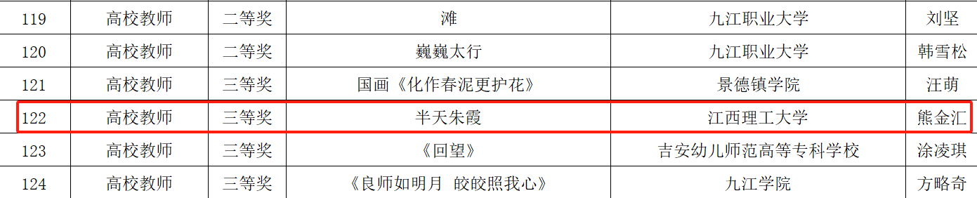 本网讯 近日,江西省教育厅、江西省文学艺术界联合会联合发文公布全省大中小学书画大赛获奖名单,此次大赛由校团委进行精心组织,统筹安排,快猫 建筑与设计学院熊金汇老师凭借水墨作品《半天朱霞》脱颖而出,荣获教师组三等奖。