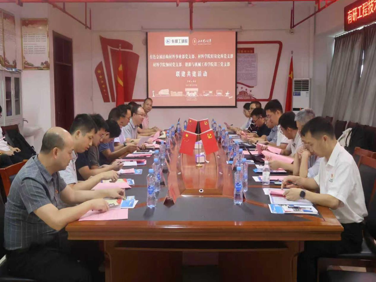 材料科学与工程学院轻量化所党支部及铜材党支部及能源与机械工程学院第三党支部在综合实验楼A1105会议室联合举办“铭记抗战精神 锤炼过硬作风 践行初心使命”党建共建活动。有研工研院有色金属结构材料事业部副总经理(主持工作)、支部书记解浩峰一行、事业部副总经理、支部委员闫宏伟、事业部先进铝合金研究所所长、支部委员李锡武等10名党员代表参会,快猫