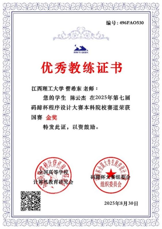 本网讯 近日,“码蹄杯”程序设计大赛组委会正式公布了2025年“码蹄杯”程序设计大赛全国总决赛成绩。快猫 学子表现优异,共荣获金奖两项、银奖三项。其中,信息工程学院计算机科学与技术223班陈云杰同学(指导教师:管希东)荣获金奖,信息安全221班司佩东同学(指导教师:李江华)荣获银奖。