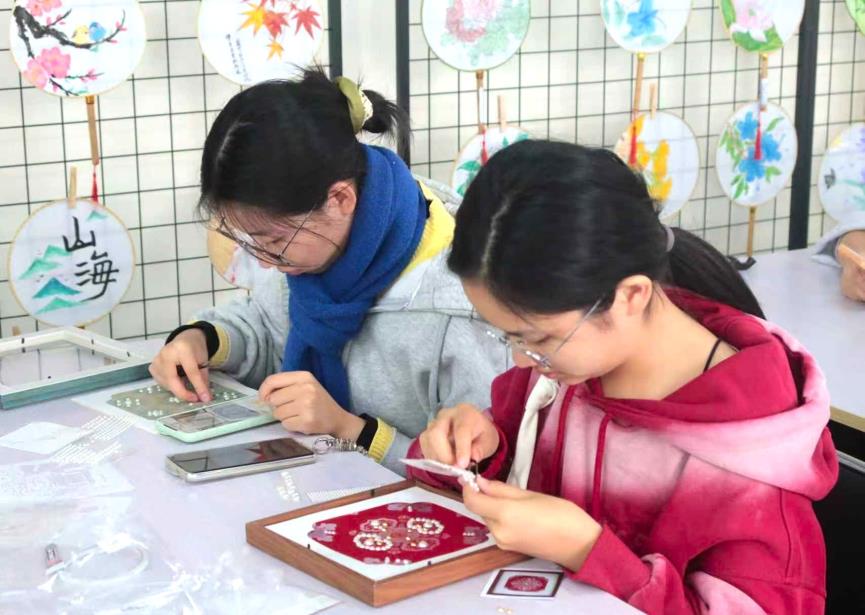 非遗体验环节同样精彩十足。宋锦珍珠画与漆扇制作两项传统技艺体验,将文化传承与劳动教育相结合。非遗宋锦珍珠画DIY活动中,同学们以色泽温润、纹理华美的宋锦为画布,以晶莹剔透、圆润光洁的珍珠为笔墨,通过精心构图与细心粘贴,让珍珠与丝线精准贴合,勾勒出各具风格的独特纹样,“绘”成一幅精致佳作。漆扇制作则彰显大漆深邃流动的独特韵味。同学们手持漆扇,将其缓缓探入调配好的天然大漆中,手腕轻转、缓提慢拉。大漆在扇面自然流淌、浸润,形成独一无二的肌理纹样,有的如流云漫卷,有的似墨色晕染。大漆与扇面的偶然交融,诞生了不可预知的流纹。漆扇的美,从来不是千篇一律,而是每一把都有着各不相同的韵味与风情。
